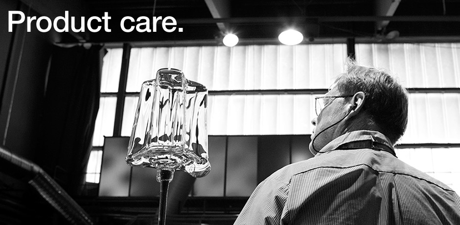 All of Iittala’s utility glasses can be washed in the dishwasher. The glasses should be positioned in the top rack of the dishwasher so that they do not touch each other during the wash cycle. The surface area of glass expands when heated and therefore glasses should not be stacked while still warm from washing as they then may stick together and break. Delicate stemware, pitchers and jugs, mugs, large-footed dessert bowls and objects with glass of varying thickness should be washed by hand.
